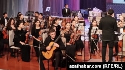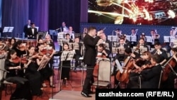 На сцене были только музыканты - струнники: скрипачи, виолончелисты и контрабасисты. Скрипачи играли стоя. Солировали Сельбинияз Мулькаманова (скрипка) и Какагельды Ходжалеков (виолончель).