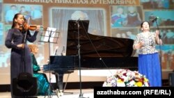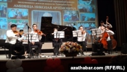 (скрипка), Тахира Атаева (альт), Аннаораза Довлетова (виолончель), Исмаила Сахетмурадова (контрабас) и Абадан Мередовой (ф-но) исполнили танго "Смерть ангела" Астора Пьяццоллы и любимое произведение Николая Артемовича "Танец Айши" из балета "Семь красавиц" Кара Караева.