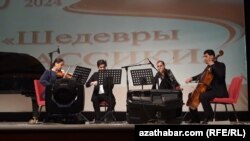 В струнном квартете вместе со скрипачем, студентом третьего курса, Сейраном Атаниязовым, победителем Дельфийских игр в Бишкеке 2023 года, альтистом Эльманом Насыровым и виолончелистом Какагельды Ходжалековым Айболек Мухиева исполнила три композиции.