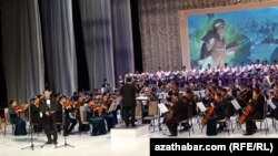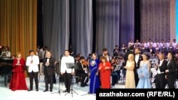 Завершила концерт песенная композиция Реджепа Реджепова "Туркменистан" в исполнении солистов Атаджана Бердыева и Гузель Аннахановой вместе с хором.